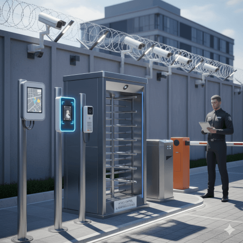 Biometric/RFID, turnstiles, barrier gates, electric fencing where applicable.